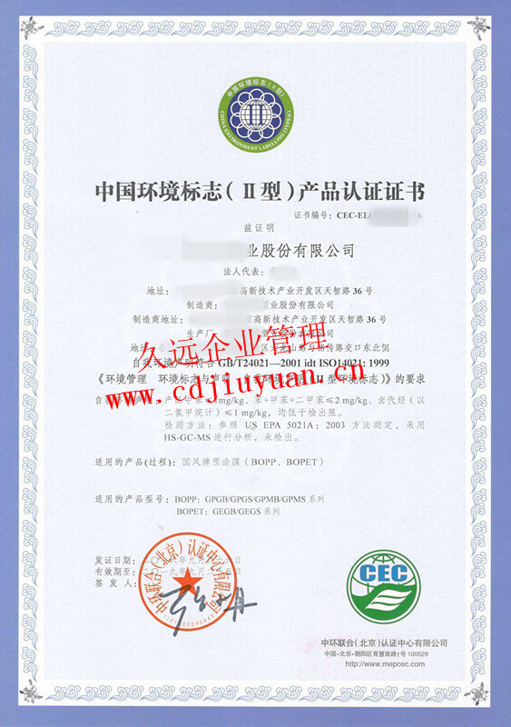 中國環境標志產品II型認證證書(十環II型)