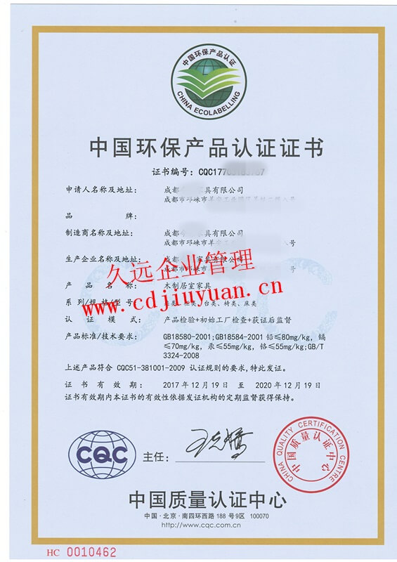 家具有害物質限量認證證書